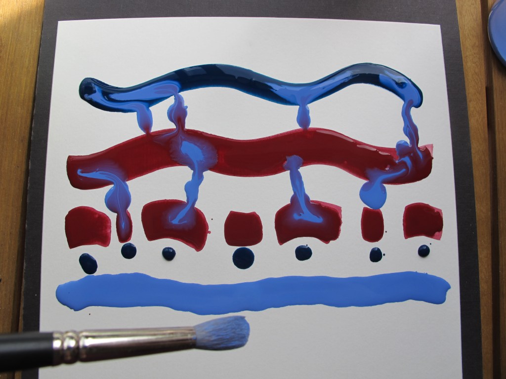 Then with a pencil, drawing into and through the wet paint, making patterns. It’s good to use card or watercolor paper, or I’ve been using the other side of cereal, biscuit packets as the card is nice and thick and doesn’t wrinkle with wet paint. It’s a nice technique to play around with, making all sorts of patterns.” Rebecca MacPherson