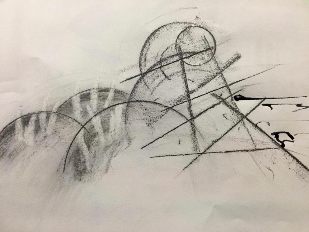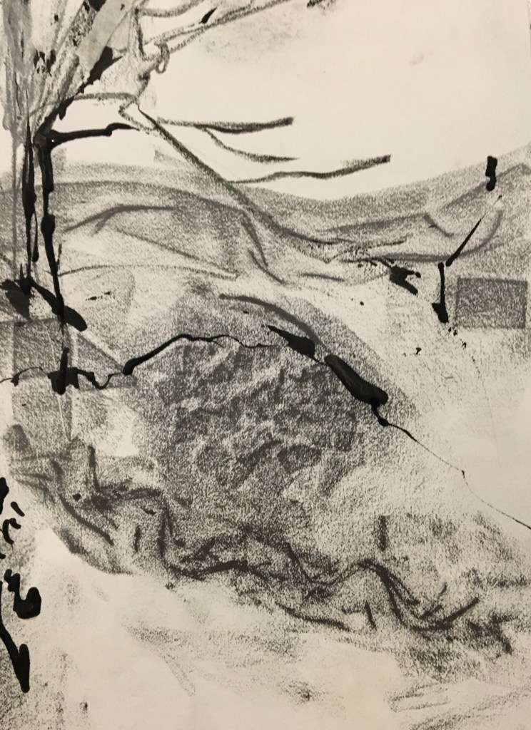 These first few sessions we’ve been focussing on having fun through expression and line, using different drawing techniques to create depth and texture, building confidence in mark making. Sara encourages us to use everything from ink and electrical tape to more familiar materials like charcoal, to build up images, adding layers of ‘frottage’ and texture from rubbings.