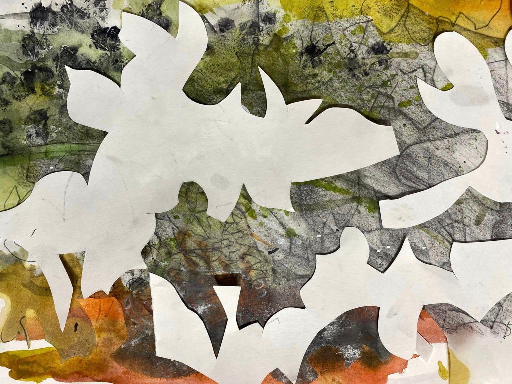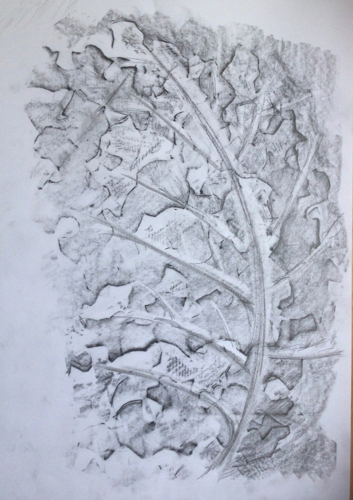 We’ve been having a delicious time in the Online Art Group with artist Sara Dudman. Ahead of each session Sara has been sharing seasonal produce as a starting point for exploring exciting new mark making techniques. So far we’ve been experimenting with hand cut frottage, ways of seeing and drawing, using different types of ink and sticks inspired by Van Gogh – all through the unexpected winter staples of curly kale and the humble potato!