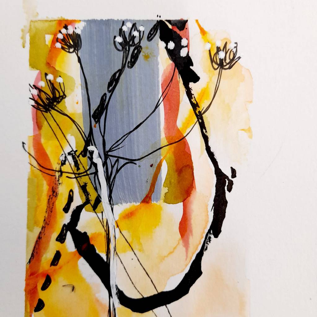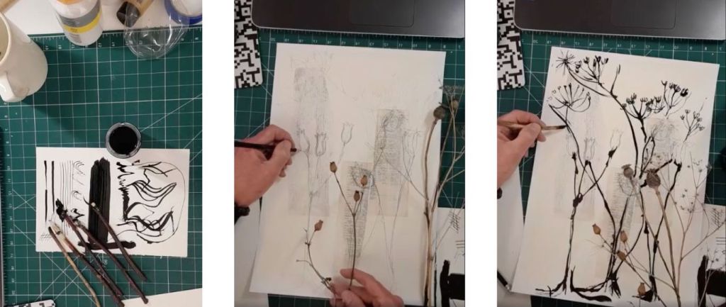 In our second session we continued that thread of layered mixed media mark making, by learning how to make brushes and tools out of found natural objects, and experimenting with the different qualities of line this can produce when nature is both your tool and your inspiration.