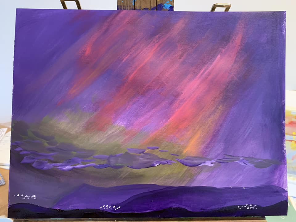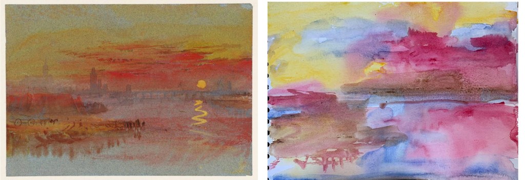And for our grand finale we looked at the incredible work of JMW Turner, and how he pushed landscape painting into abstraction. Recreating one of Turners iconic, expressive sunsets to mark the end of the day and the end of this 4-week block of classes, we used fun and experimental washes of acrylic, gouache and watercolour. Plus there was a bonus surprise inspired by recent sightings of the Northern Lights in Somerset.