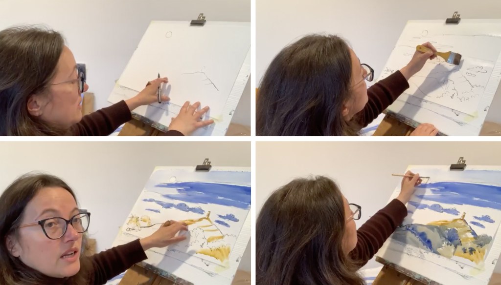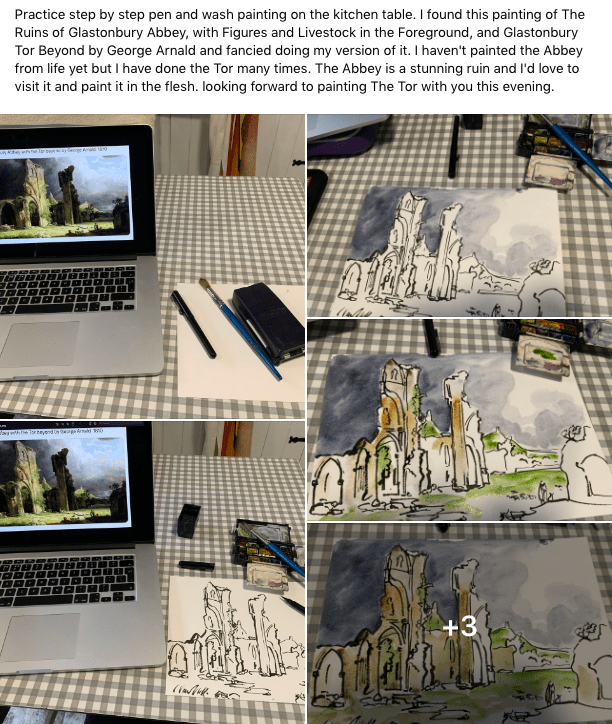 Starting closer to home with views of the Glastonbury Tor, we began by understanding how to capture and render the landscape in simple pen and wash before moving onto a larger scale full painting in layered water colours, brush pens and inks. Whilst method and material was as important as ever, the real focus of this session was understanding how our choices in composition, focal point and viewpoint can make all the difference!