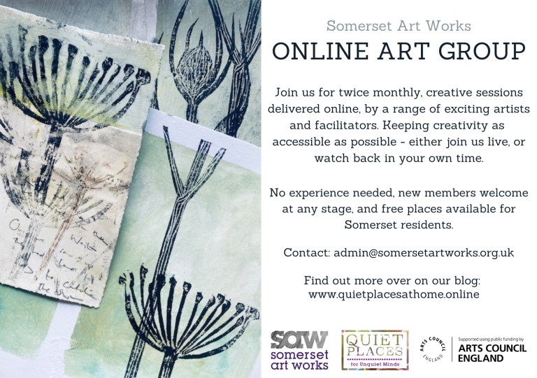 Somerset Art Works – Online Art Group Running throughout the year, first and third Wednesdays 6.30 – 7.30pm on Facebook Live. Plus recordings to revisit at any time via the Facebook group page – take part at a time that suits you. For Somerset residents – free places available (donations welcome). New members welcome.