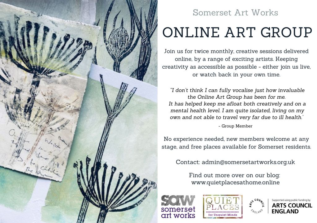The changing of the seasons is also bringing change to the Online Art Group, we are excited to soon introduce you to our next artist who will be taking the helm and joyfully guiding us through winter. Until then, as always, we offer free places to Somerset based residents and welcome new participants at any time. For more information please contact Emily on: admin@somersetartworks.org.uk
