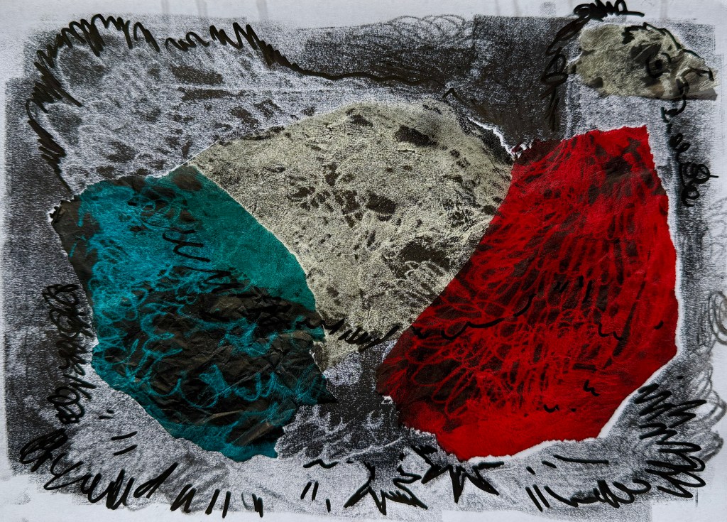 We then moved on to monotype printing: the process of drawing onto an inked up surface to create line based designs, and experimented by adding elements like coloured or textured tissue paper to add variation and colour. The result was a whole new range of sketches, drawings and marks with finishes and textures that we can now take away and integrate into our individual creative practices.