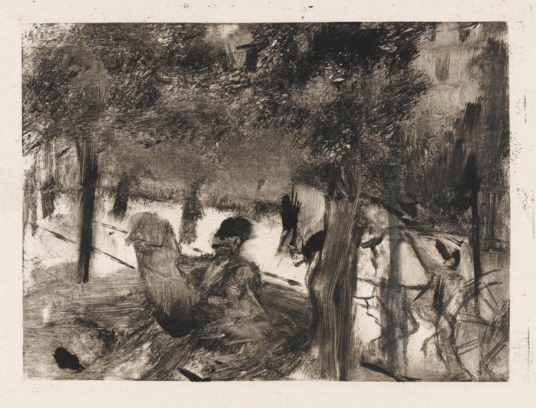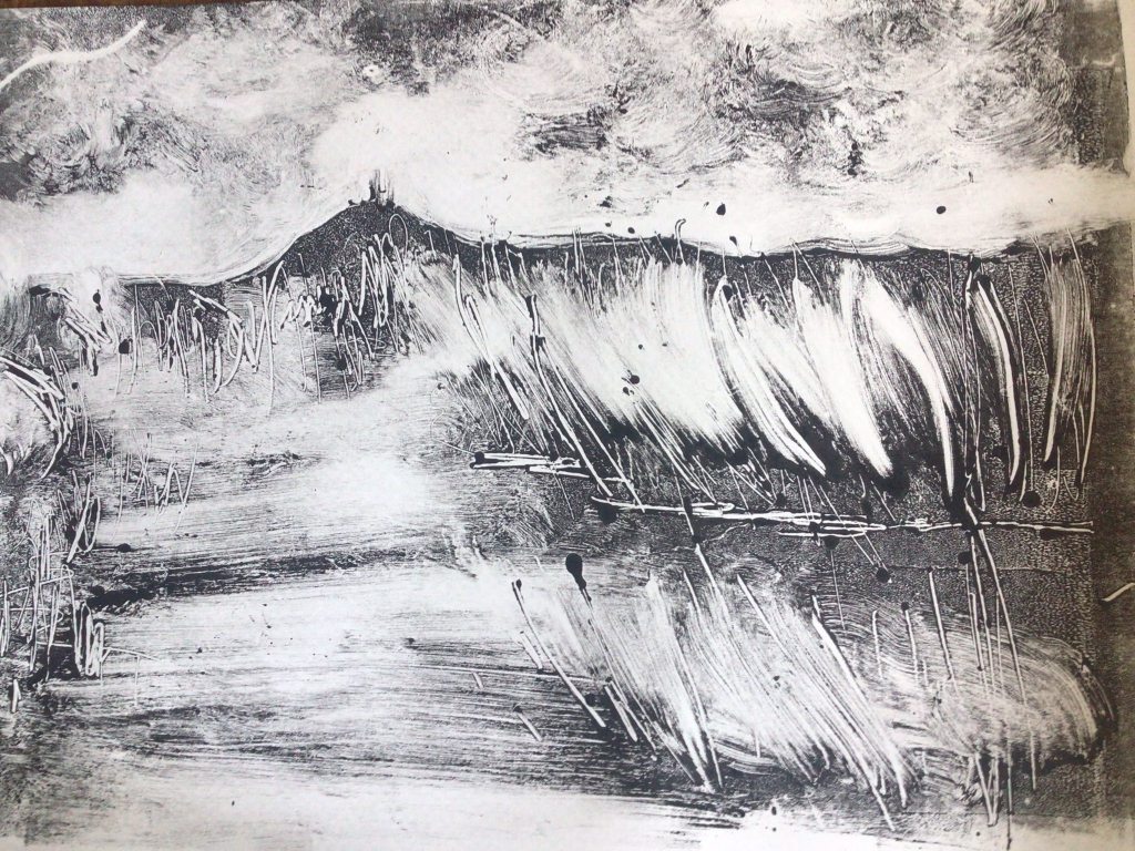 We began by trying wipe-away mono printing. A fun and loose method that challenges our level of control, using cloths, white spirit, and paintbrushes to create an image. Inspired by the dreamy textures of Degas, who also favoured this technique, we began creating our own moody and ethereal landscapes.