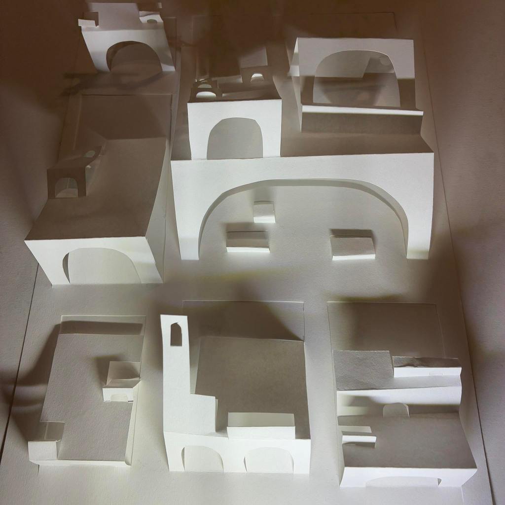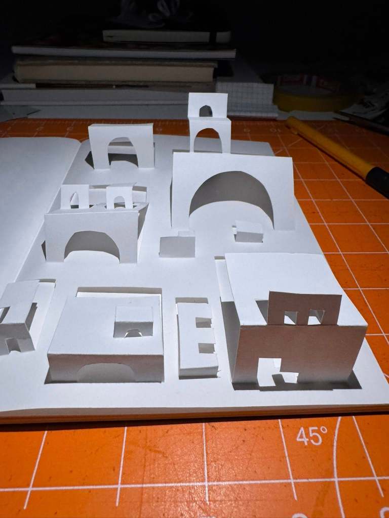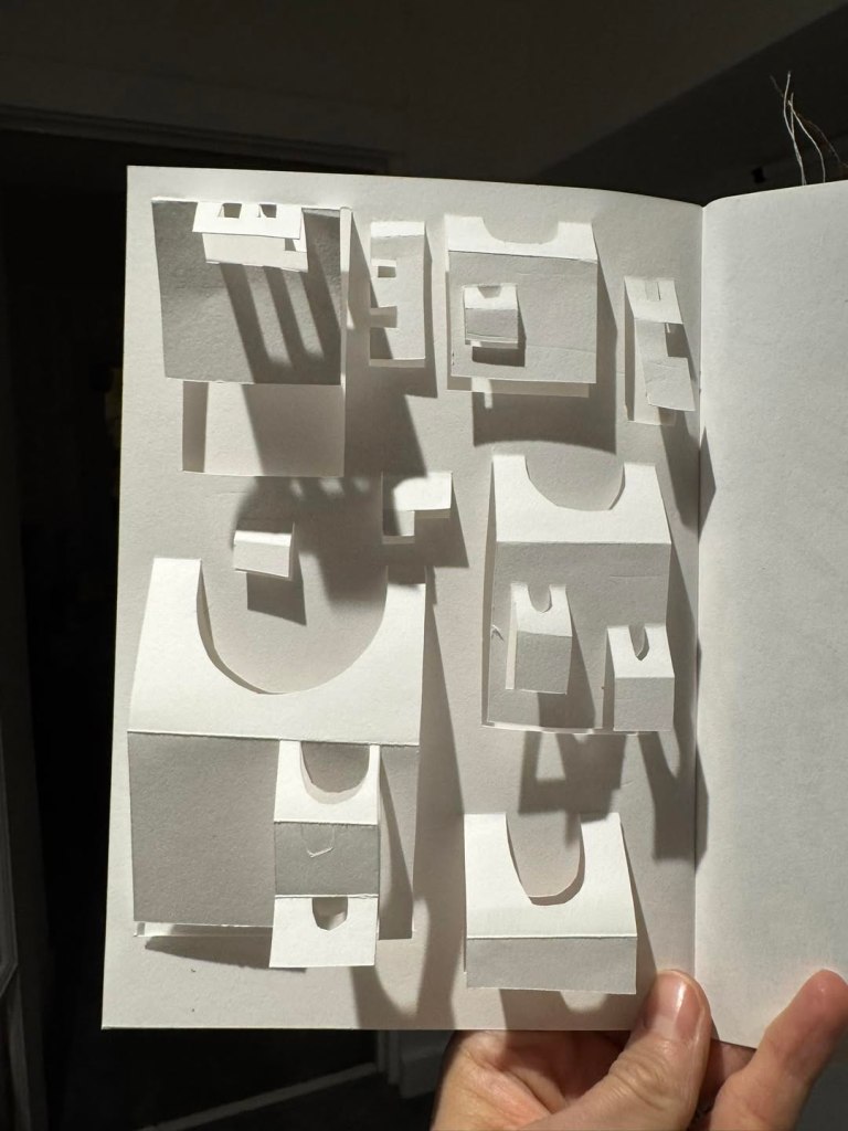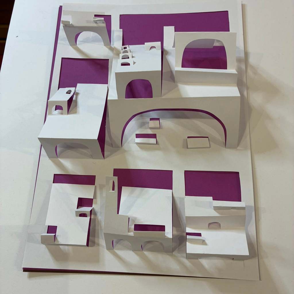 In our December session, Ernst Röttger’s book, Creative Paper Craft, continued to guide us as we we broke away from the constraints of 2D working, and slowly and meticulously worked on cutting and folding a striking 3D paper city from just a single sheet of paper. The process was a little tricky at first, as each cut has a huge impact on the final result, but once we got the hang of it the impact (as you can see from the photos) is so satisfying and striking!!